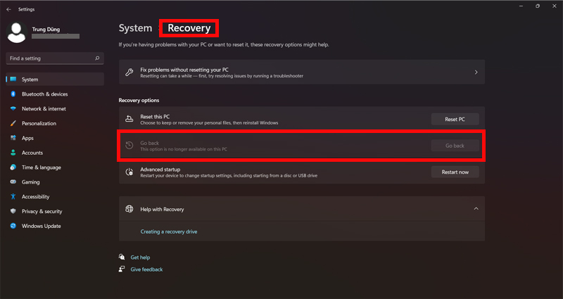 Khi update lên phiên bản Windows mới, nhà sản xuất sẽ cho bạn 10 ngày để hạ xuống bản cũ. Rất đơn giản, đầu tiên vào Setting và Update and sercurity và Recovery và Click.