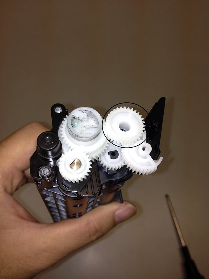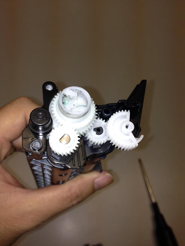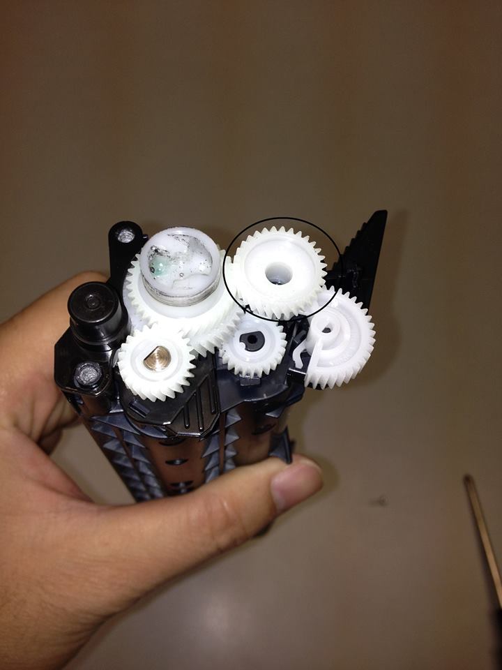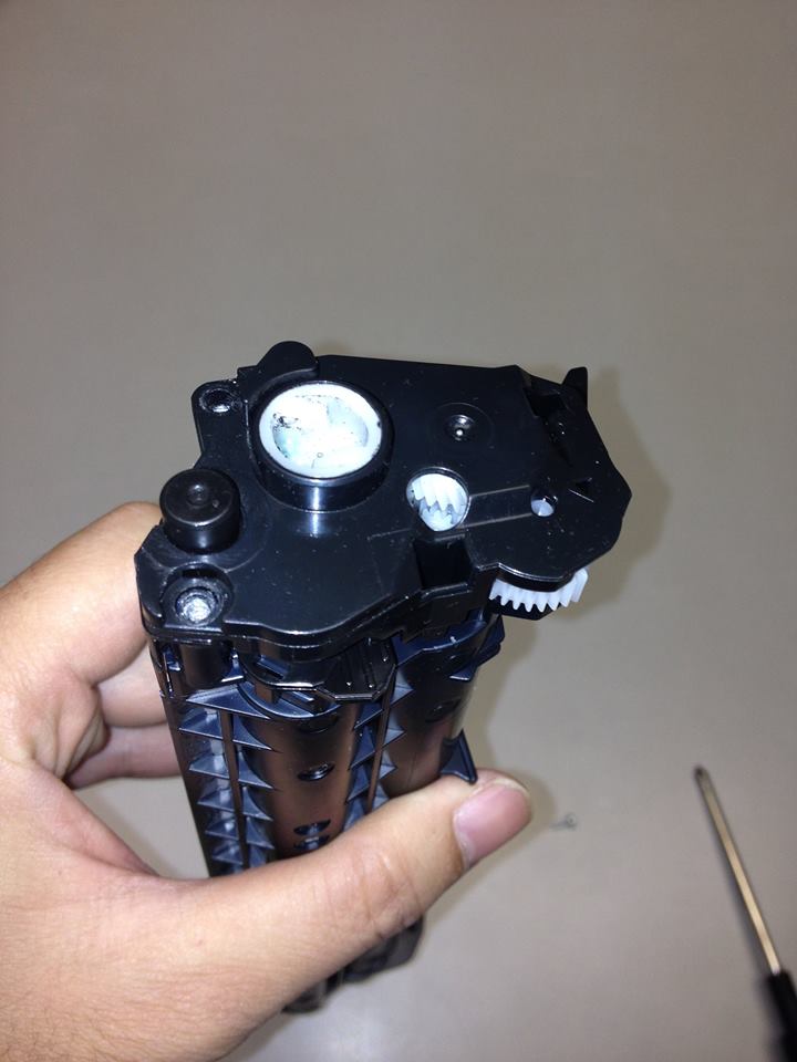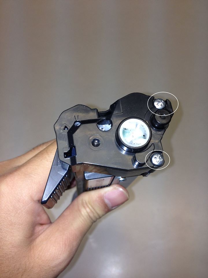 Bước 1: Hộp mực TN-1010 Sau khi đổ mực xong chúng ta dùng tua-vít vặn 2 ốc ở đầu ốp bánh răng của hộp mực khoanh trong hình ra sẽ nhìn thấy cụm bánh răng của hộp mực.