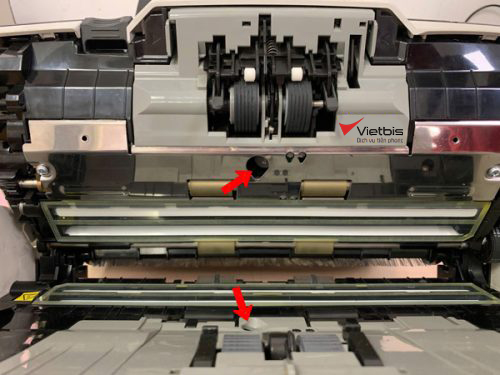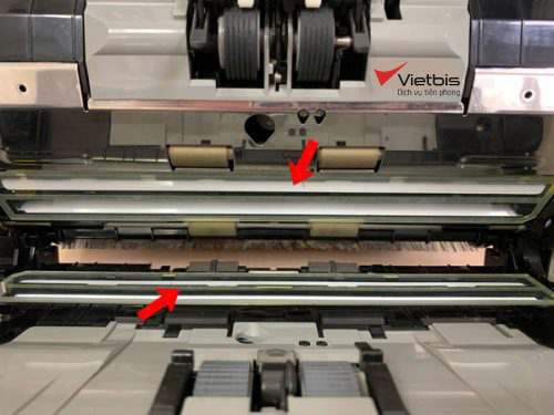 - Dùng khăn mềm và dung dịch vệ sinh chuyên dụng lau sạch bề mặt kính và cảm biến giấy bên trong nắp máy.