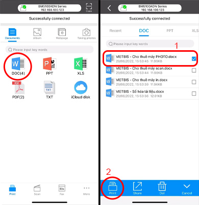 Bước 2: Ở đây mình chọn Doc -> chọn văn bản và bấm Print ( In )